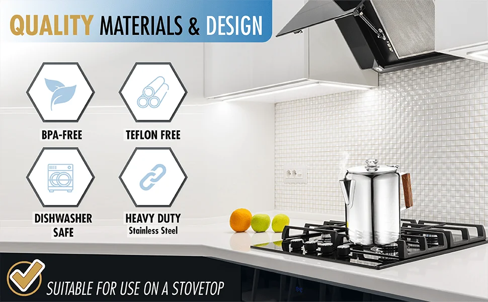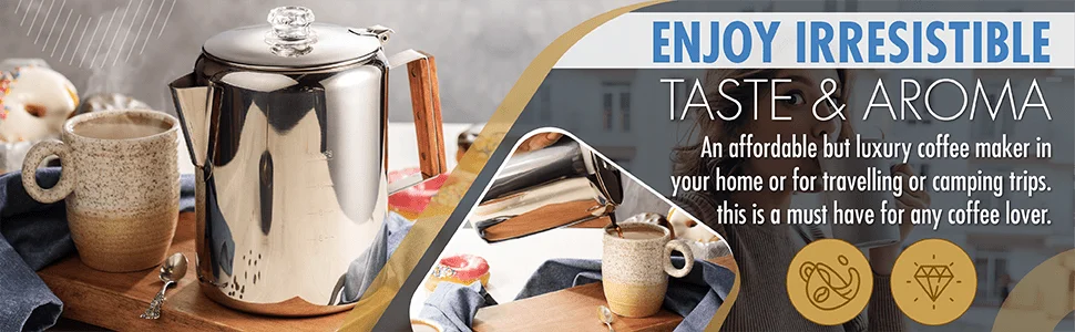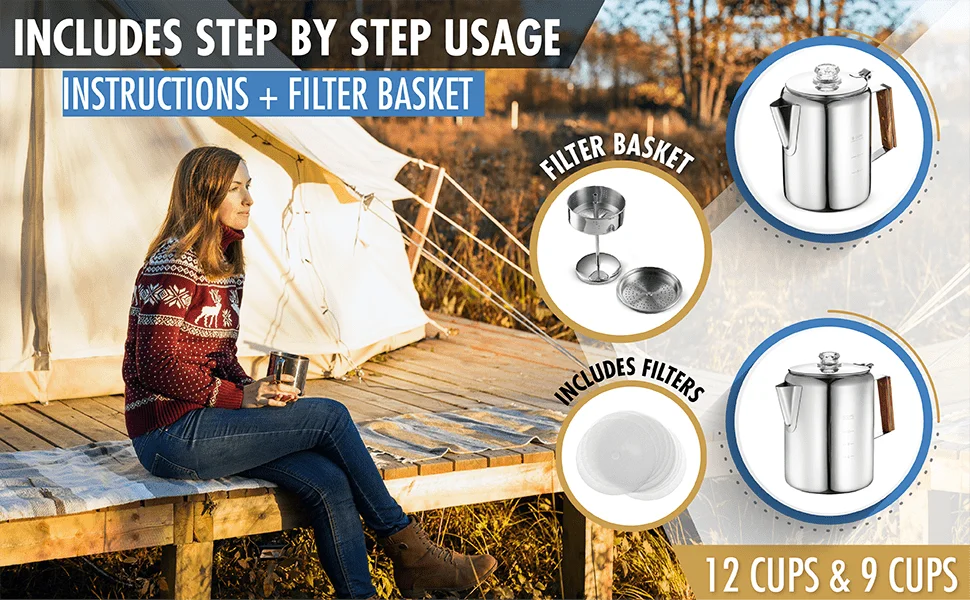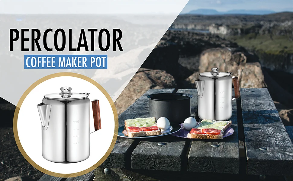 - ☕【GOOD FOR OUTDOORS OR POWER OUTAGE】The percolator is designed for outdoor & indoor use. It’s suitable for use on an camping fire, gas stovetop, electric stovetop and grill. Especially suitable for power outages due to hurricanes, you can still enjoy coffee at home. It makes the perfect addition to any home kitchen.