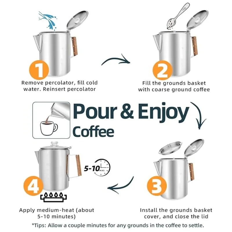 - ☕【FAST & SIMPLE TO USE】You can take camping coffee makers anywhere. Just fill with the pot with cold water and coarse ground coffee into the percolator coffee pot and then place it over the medium-heat to boil. Your coffee will be ready in no time at all! (about 5-10 minutes, according to your taste)